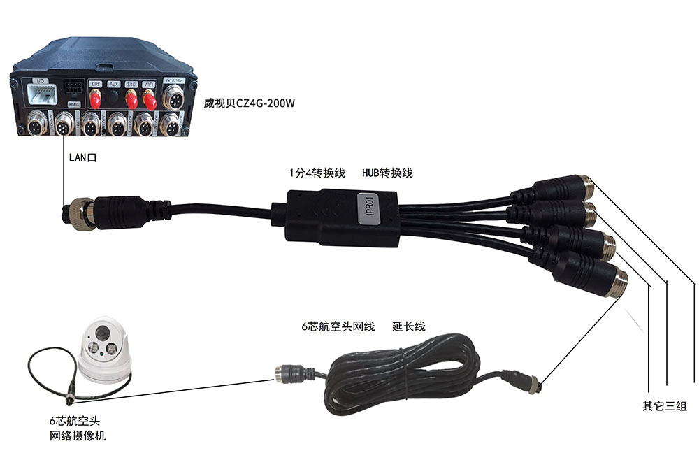 連接IPC網絡高清攝像機實現車載NVR功能,接線示意圖: