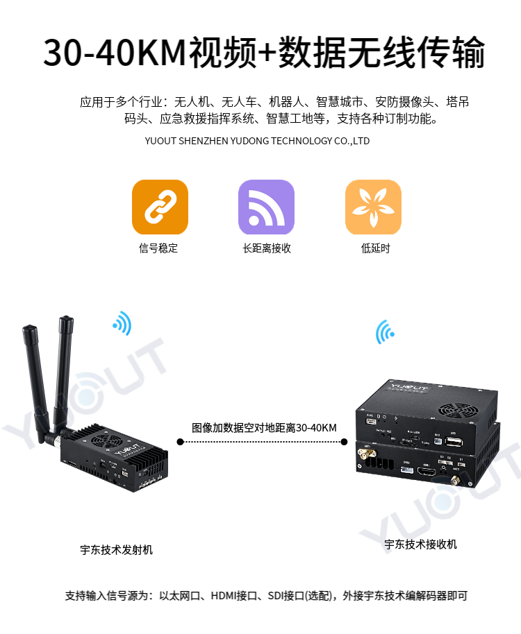 YD-TS0030-WK  是應用于無人機行業的圖數控一體化超遠距離無線傳輸設備(最遠可達 30至40 公里),具有體積小、功耗低、通信距離遠等特點,支持高清視頻、飛控數據、云臺控制數據、遙控器控制數據等同時傳輸。